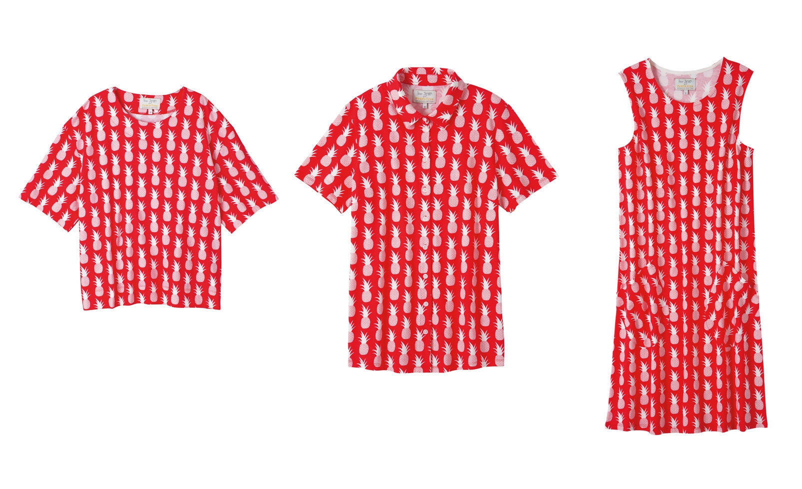 今までもキュートで、独特、そしてどこかユーモアのあるデザインを発表してきましたが、今回のコレクションもとてもユニーク。ロブスターにパイナップル、ラビットというピーター・イェンセンならではの遊び心に溢れた3つの柄を、オーガニックコットン100%のトップスやワンピースにプリントしました。