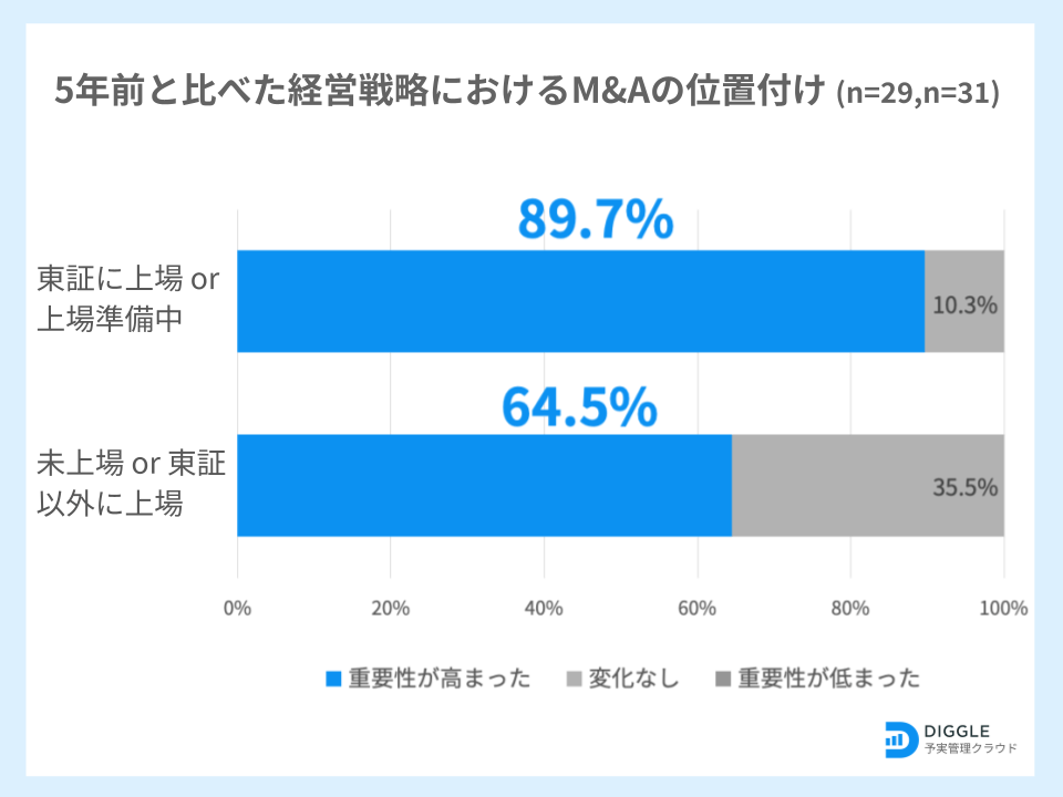 ・M&A業務に携わっている方の77.4%が、5年前と比べてM&Aの「重要性が高まった」と回答。東証上場/上場準備企業に絞るとその割合は89.7%。