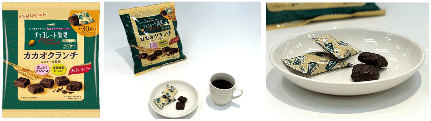 カカオクランチは、板タイプの高カカオチョコレートが苦手な方にもオススメしたい商品を開発できたと考えております。今後も、より多くの方にカカオポリフェノールをおいしく楽しく継続的に摂取いただけるような新しいラインアップの開発を日々進めております。明治チョコレート効果の今後にぜひご期待ください。