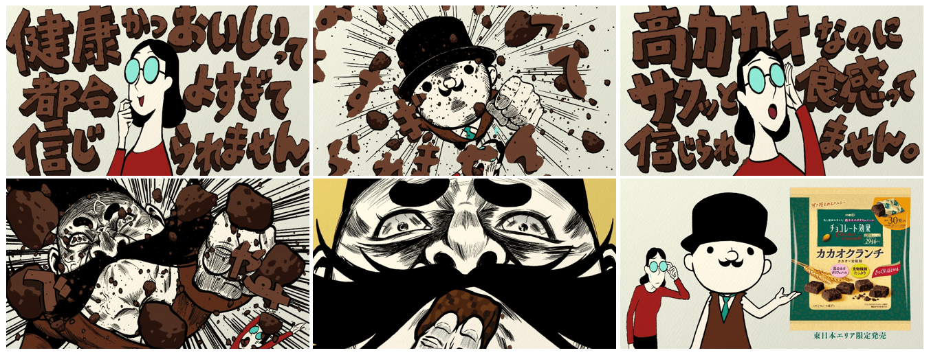 10月1日(火)より、WebCMチョコレート効果 「カカオクランチ新発売」篇を公開します。帽子を被り、立派なひげたくわえた“チョコ先生”がアニメーションになって登場。健康とおいしさ、健康とお菓子っぽさの両立は難しい、という先入観をチョコ先生が壊していきます。「チョコレート効果 カカオクランチ大袋」の特長である、高カカオなのに、サクッとした食感を表現したCMです。