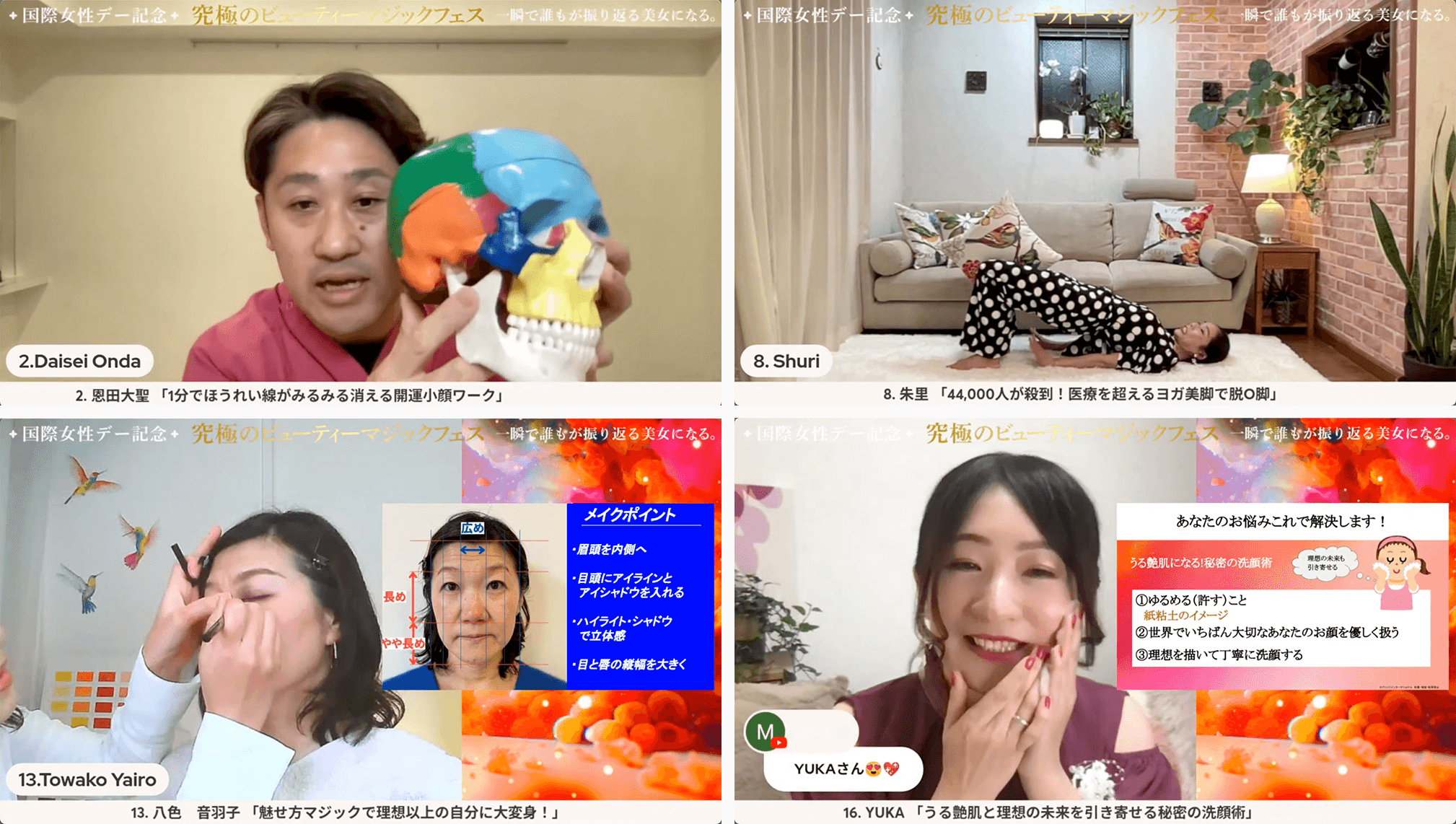 この度、2024年3月8日にオンラインで実施した『ビューティーマジックフェス~一瞬で誰もが振り返る美女になる~』の詳細や当日の様子をご報告いたします。当日のライブ同時視聴者数は1,140名以上、2024年3月18日現在で動画の再生回数は9,400回を超えています。
