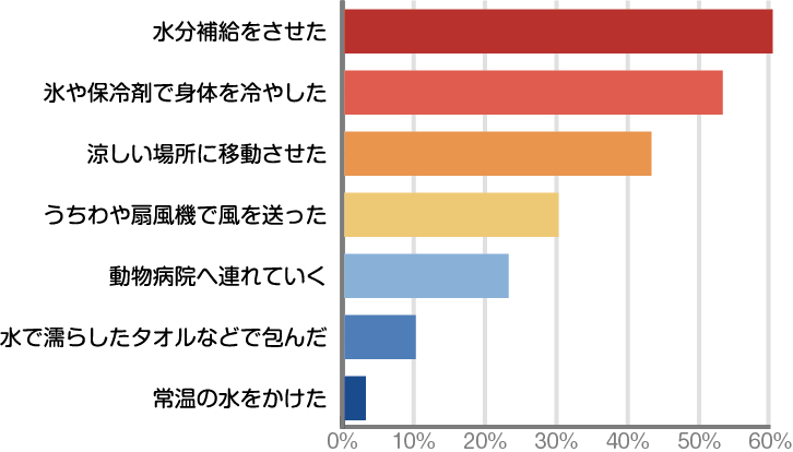 ペットが熱中症になったと感じたことのある方に「どのような対応を行いましたか?」と質問したところ、「水分補給をさせた」(60%)、「氷や保冷剤で身体を冷やした」(53%)、「涼しい場所に移動させた」(43%)とご自宅ですぐに応急処置を行う方が多くみられ、23%の方がすぐに動物病院へ連れていかれるようです。