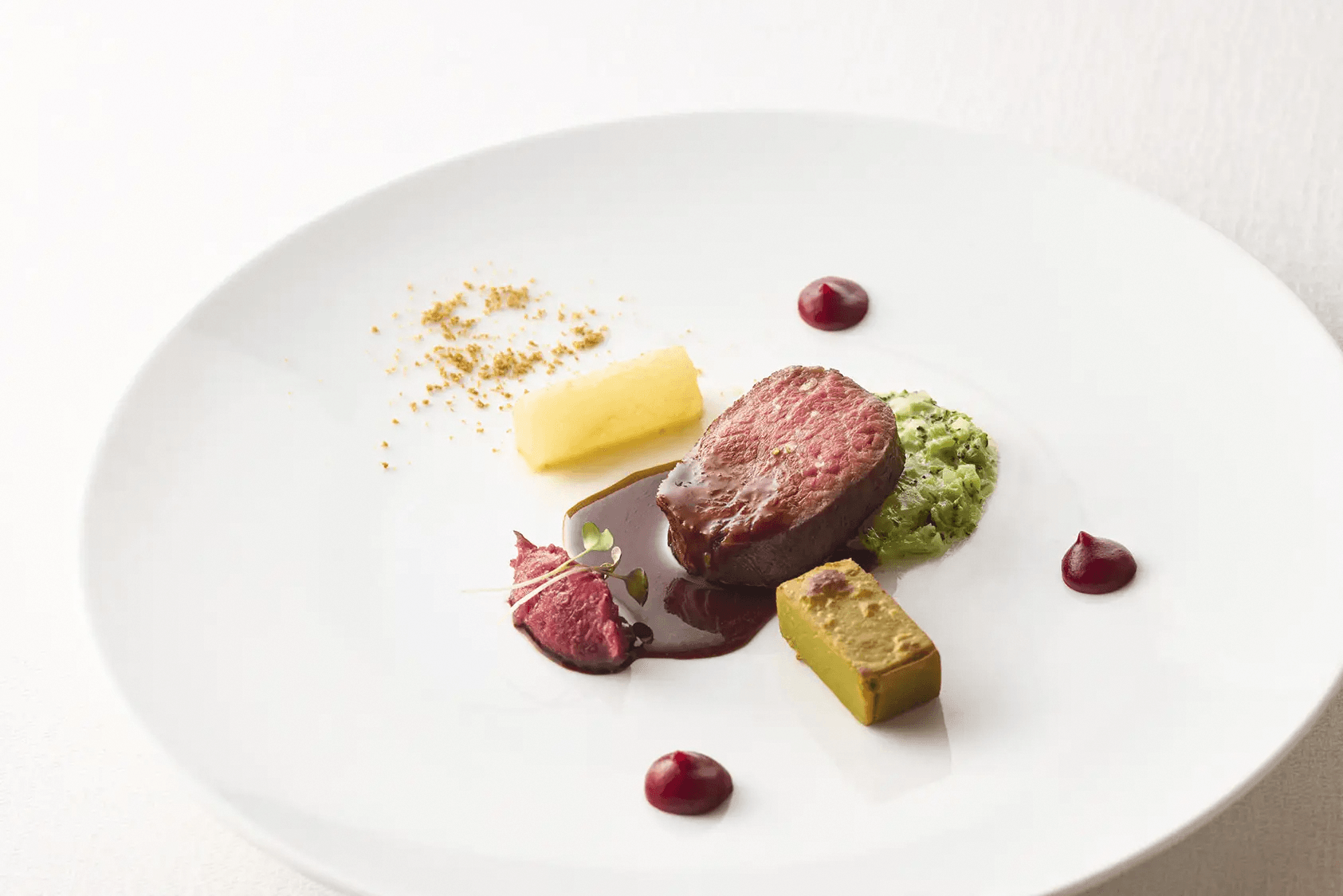 メニュー:鳥取和牛オレイン55フィレ肉のロティ 鳥取県産大山ブロッコリーのコンポテ ソース・ポワブラード