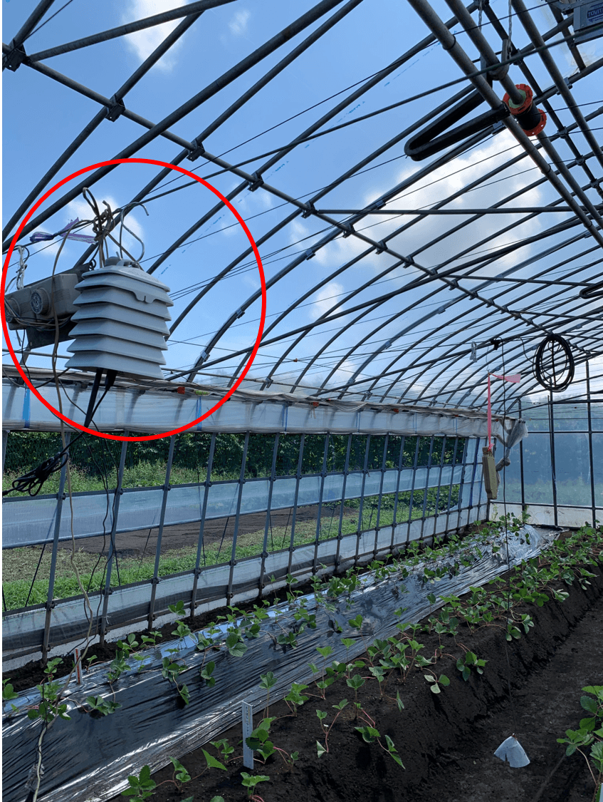 現場では、ハウス内の生育環境を整えるために、ハウスへ頻繁に見回りへ行く必要がある、という声がありました。そこで、省力化のための遠隔管理のシステムを低コストで製作いたしました。