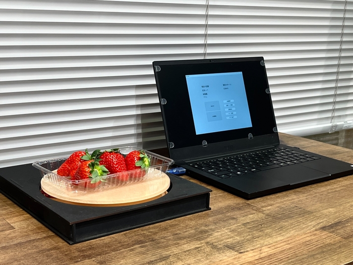 収穫物を重量センサーで計測します。現状では、いちごを対象として、ある特定の品種に対してサイズ別(S,M,L,2L,3L)の合計個数、合計収穫量、不良個数、不良合計収量を自動的にパソコンに記録します。