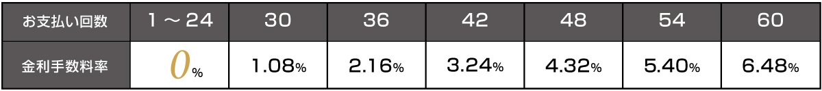 期間中に対象店舗にて対象製品をご購入頂き、お支払いに下記分割払いをご選択頂いた場合、手数料と金利を最大24回払いまで無料で、30回~60回払いの場合は特別金利にて提供致します。