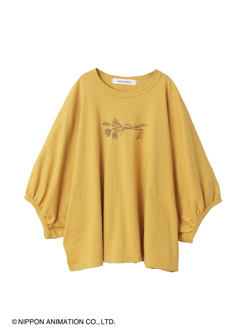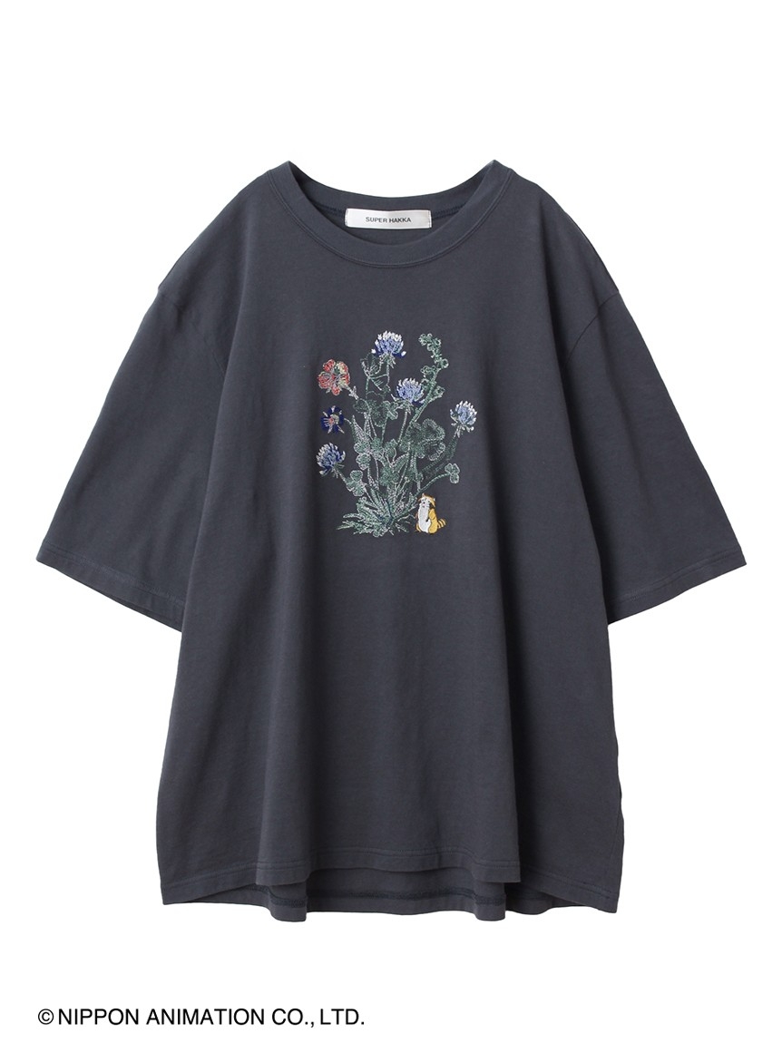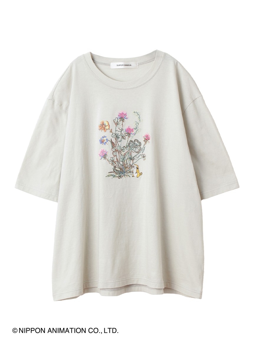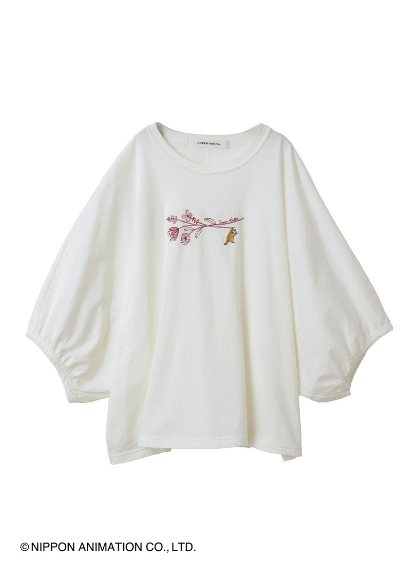 ラスカルとお花の刺繍を施した、ボリュームのあるドルマンスリーブTシャツ。SUPER HAKKAらしい線画のお花の先には、ラスカルがぶら下がっています。程よい丈感でボトムを選ばずスタイリングしていただけます。