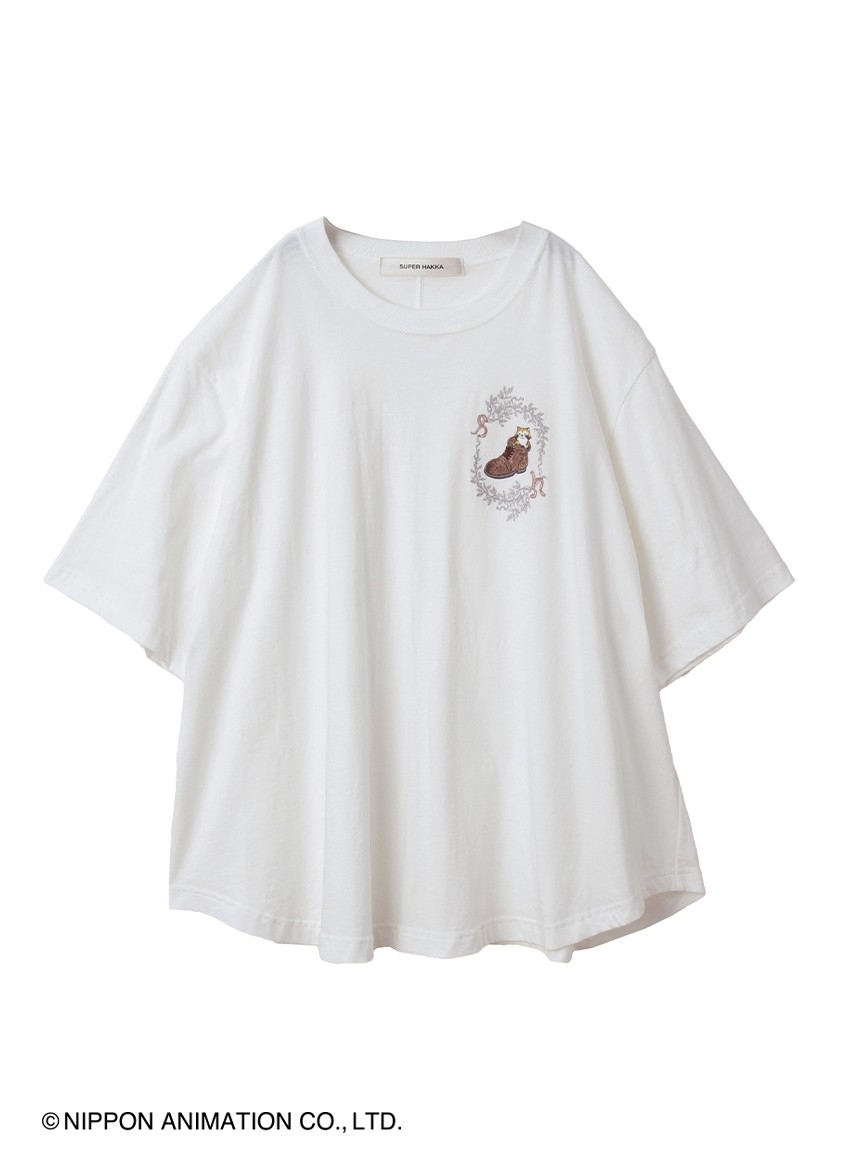 ブーツから顔を出したなんとも可愛い表情のラスカルのモチーフを、刺繍で胸元に施したフレアTシャツ。ボディラインを拾いすぎない程よくフレアなシルエットで、女性らしい柔らかい雰囲気を演出してくれます。クラシカルな蔦のフレームに見えるさりげないSHの文字がポイントです。