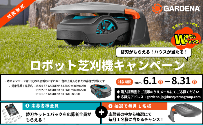 ( gardena-jp@husqvarnagroup.com )まで「ロボット芝刈り機キャンペーン」