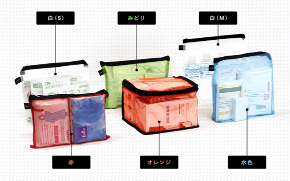 セットは1人分の水や食料、衛生用品など避難時に必要なものが揃っており、セット限定の荷物が濡れにくいジッパー付きポリ袋により袋を密閉にでき、ポーチや中身を浸水から守ります。