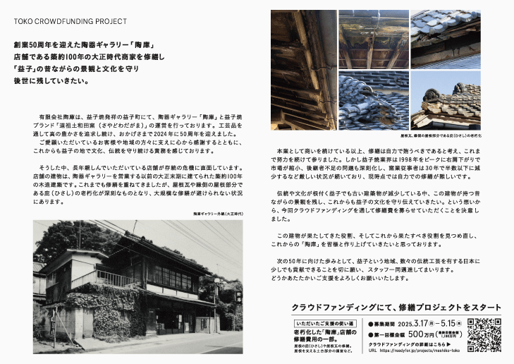 益子焼の産地・栃木県益子町に拠点を構え、陶器ギャラリーとして1000回以上の展覧会を開催してきました。作家の表現を尊重し、暮らしの中で陶器が生きるような提案を続けてきた一方で、拠点となる建物は大正末期に建てられた木造家屋であり、老朽化が深刻な状況にあります。