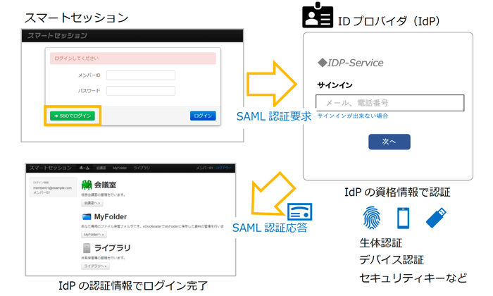 従来スマートセッション上で行っていたID・パスワードでの認証に代わり、外部のIDプロバイダ(以下 IdP)とスマートセッション間でSAML2.0規格を用いて認証を行う機能です。