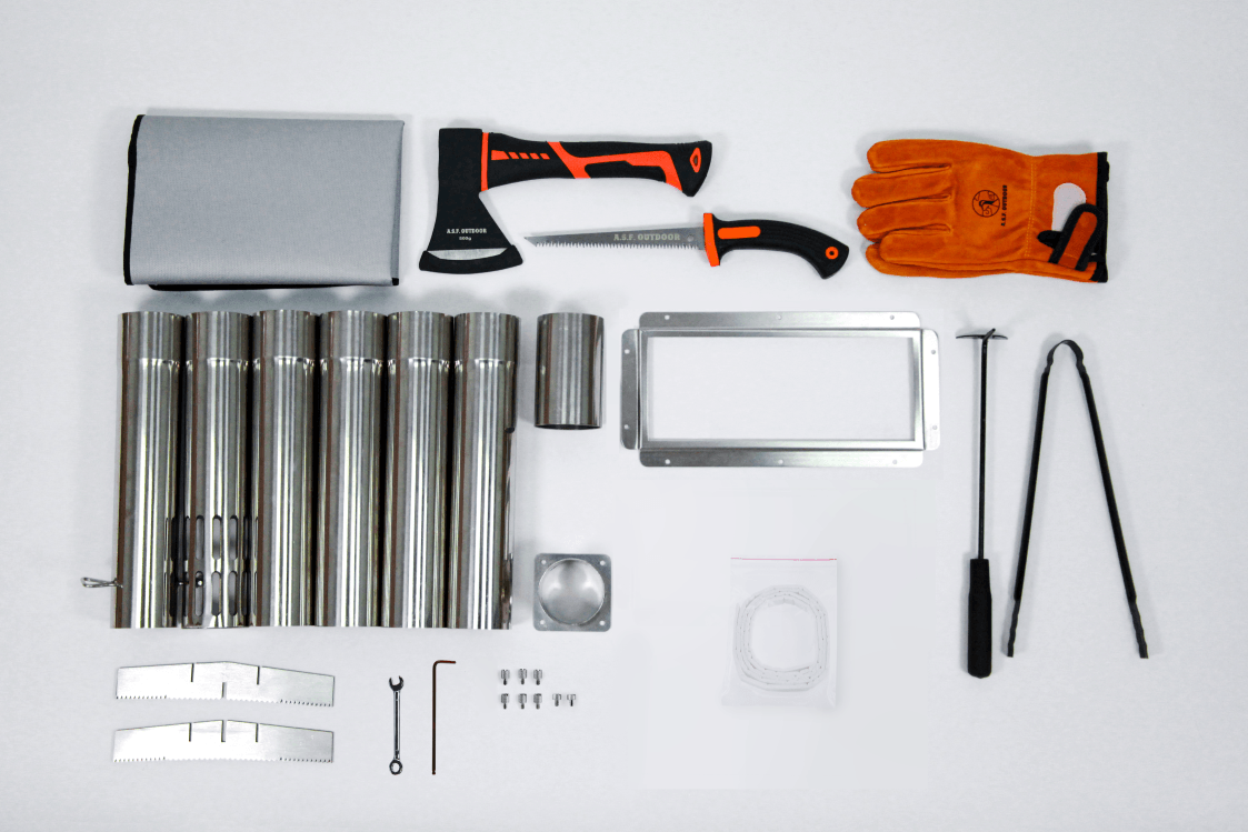本体、煙突(五徳用)、煙突(連結用28.5cm×6本)、煙突固定用台座、五徳、専用バッグ、手斧、のこぎり、耐熱グローブ、防炎シート、灰かき棒、火ばさみ、レンチ・六角レンチ、ガラス(本体装着済み)、ガラスフレーム×3、交換用ガスケットシート(1m)、予備ネジ(2×2本)、説明書