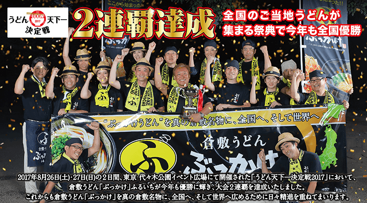 株式会社ふるいちの営業が軌道に乗ってきたころ、了一氏は、ブランドづくりをしたいと考えました。そんな時に目を付けたのが、うどんの日本一を決める「U-1グランプリ」でした。2013年に初めて出場したぶっかけ亭本舗ふるいちは、『売上部門1位』『評価部門3位』という快挙を成し遂げました。しかし、欲しかったのは日本一の座。食材は地元の素材にこだわり、従業員のホスピタリティを高めるなど社員教育に努めていきました。その結果、3年後、4年後の2016年、2017年ではうどんの日本一を決める別の大会である「うどん天下一決定戦」において2連覇を達成することが出来ました。