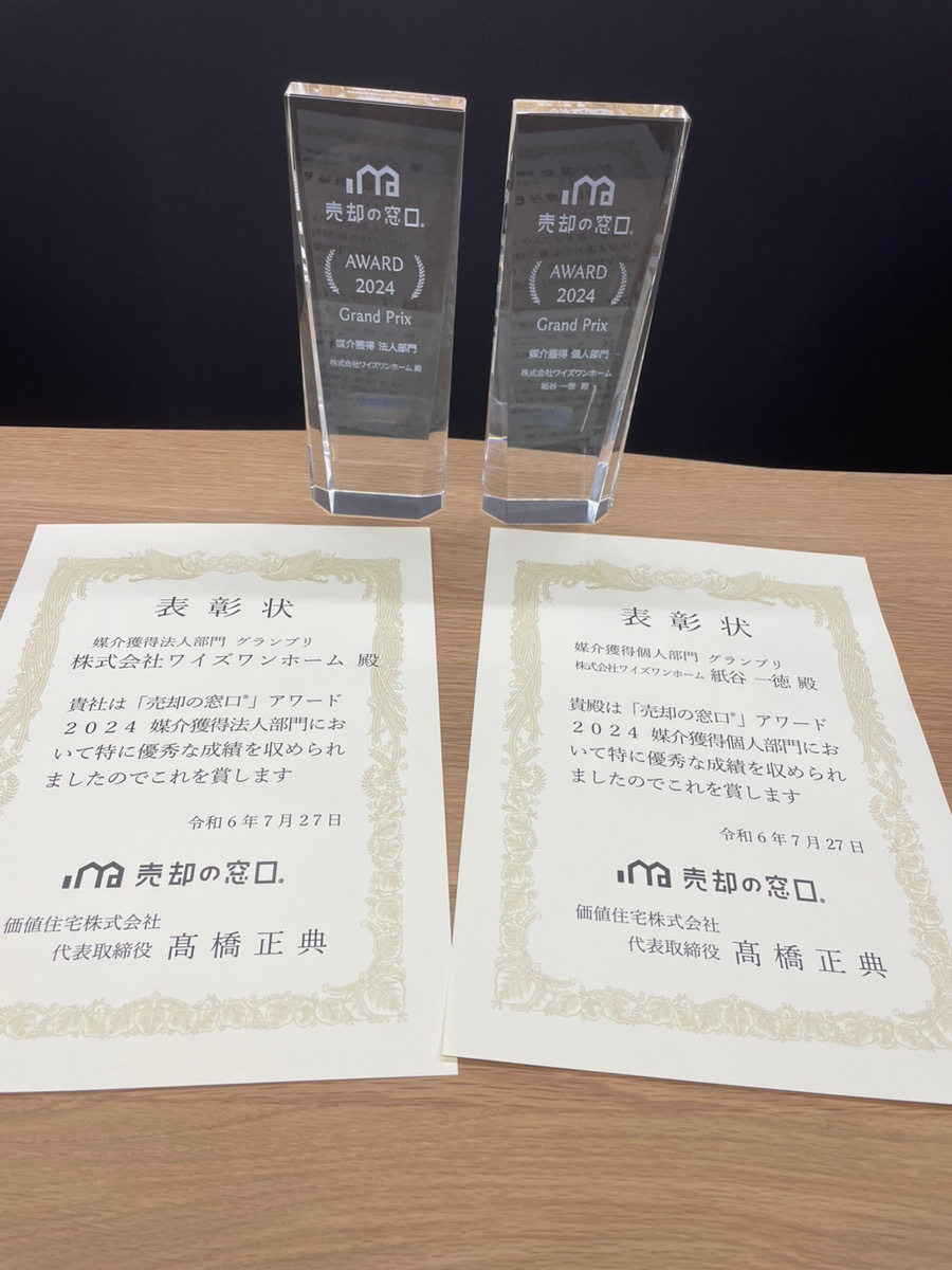 株式会社ワイズワンホーム(以下、当社)は、2024年7月27日(土)に開催された「売却の窓口」総会において、媒介件数部門で法人および個人の両部門で日本一に表彰されました。この栄誉は、当社が一貫して提供してきた高品質なサービスとお客様の信頼に基づく成果です。