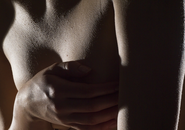 右のバストの上のほうに、うっすらと線が入っているように見えたのです。触ってみると、明らかにシリコンバッグの縁。今までは、その部分にはバストの脂肪があって、バッグに触れる感触はなかったはずですが、バストが下垂したことで脂肪が失われていたのです。指でそっと押さえてみると、バッグの形をなぞることができてしまい、「このまま放置していたら、どうなってしまうのだろう」と大きな不安が生まれたと言います。