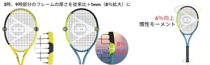 新形状はフレームの3時、9時部分の厚さを従来モデルから+1mm(8%拡大)にすることで、フレームの慣性モーメントが6%向上。安定感が向上し、打球時のブレを軽減します。