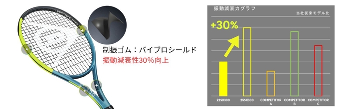 ダンロップの他シリーズにも搭載し定評のある、衝撃・振動吸収性に優れた制振ゴムをフレームの3時、9時部分とスロート部分に使用することで、従来モデルよりも30%振動減衰性能が向上しました。