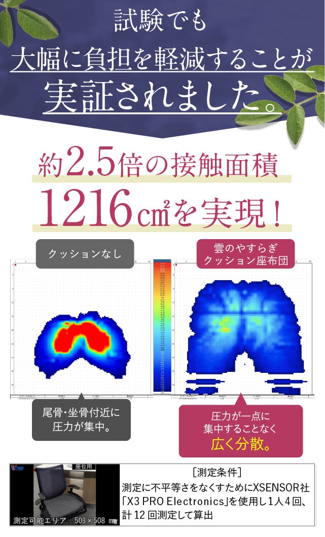 体圧分散の計測データでは、“雲のやすらぎクッション 座布団”はクッションの無い状態と比べて、接触面積が約2.5倍の1216㎝となり、体圧分散が大幅に増加していることが証明されました。