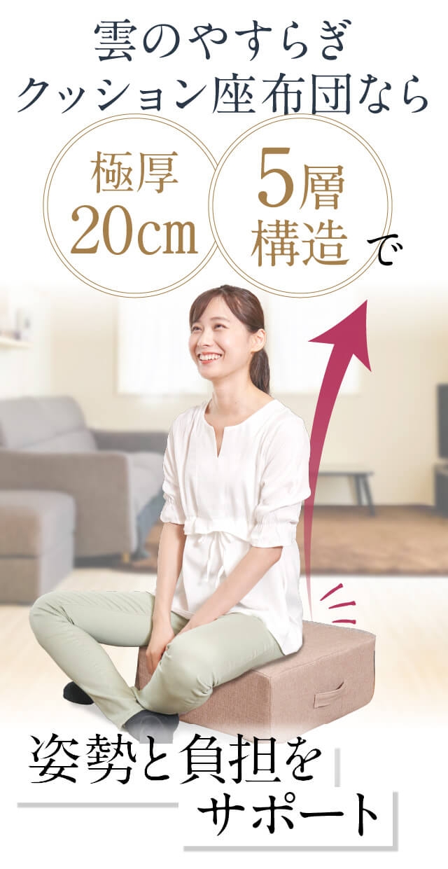 薄いクッションで床に座り続けると、正しい姿勢を続けることが難しくお尻や腰に負担が掛かってしまいます “雲のやすらぎ クッション座布団”では、こだわりの極厚20cmの5層構造で自然と正しい姿勢になり、長時間のテレワークも楽に行うことができます。