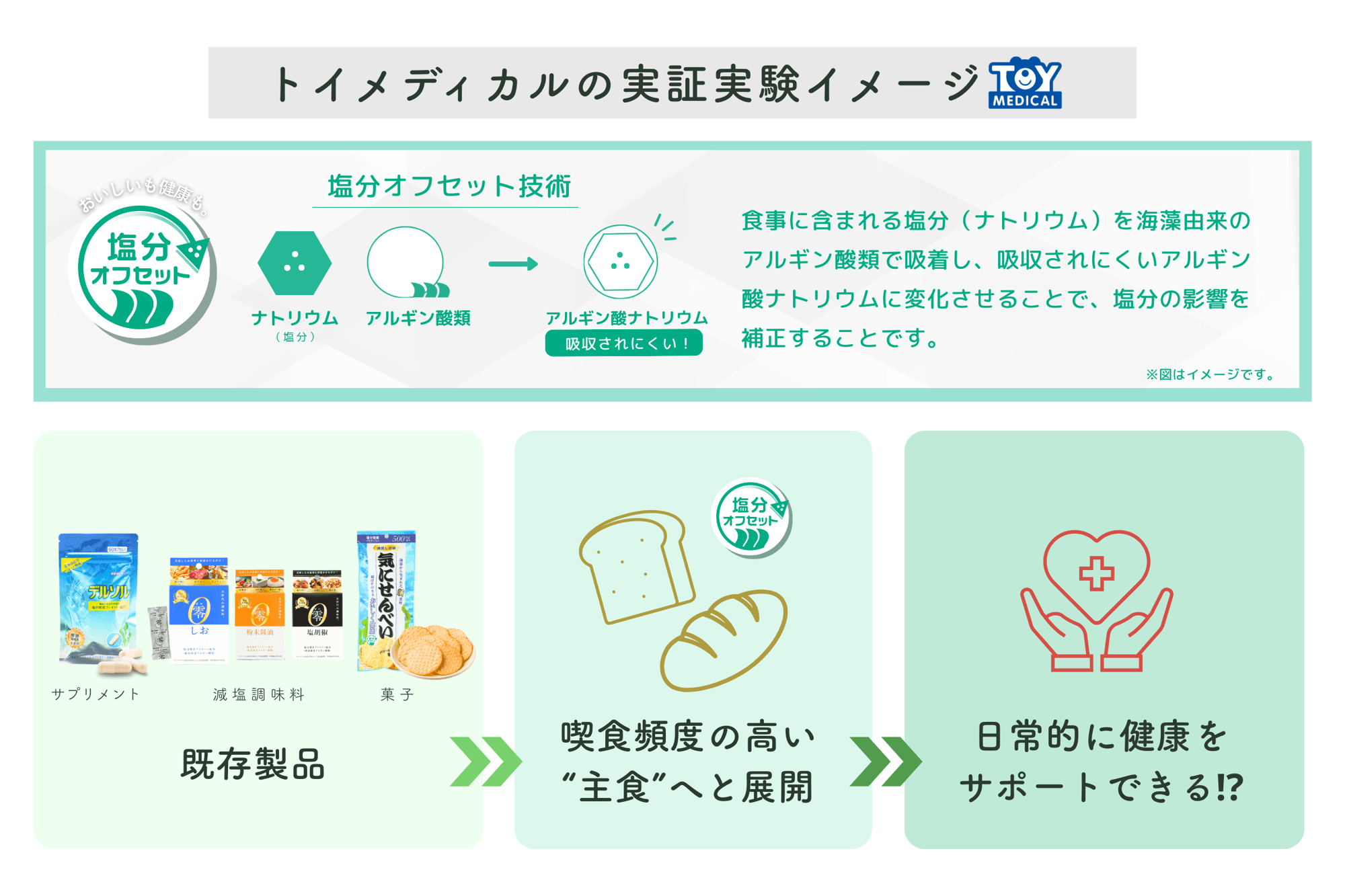 今回の採択は、当社の「塩分オフセット技術」を用いたサプリメントや調味料の実証実験に続いて3度目となります。塩分量を変えることなく、塩分の吸収を抑えることができるこの技術は、海藻由来のアルギン酸類という食物繊維を利用しており、大学との共同研究によってサプリメントタイプから様々な食品への応用が可能となりました。日常に溶け込む製品として、このアルギン酸類をパンに練りこんだ商品を開発し、味や食感などに違和感なく喫食が可能かなどの調査を行う予定です。