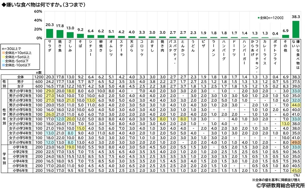 他方、嫌いな食べ物をきいたところ、1位「サラダ」(20.3%)、2位「焼き魚」(17.8%)、3位「さしみ」(13.0%)となりました。
