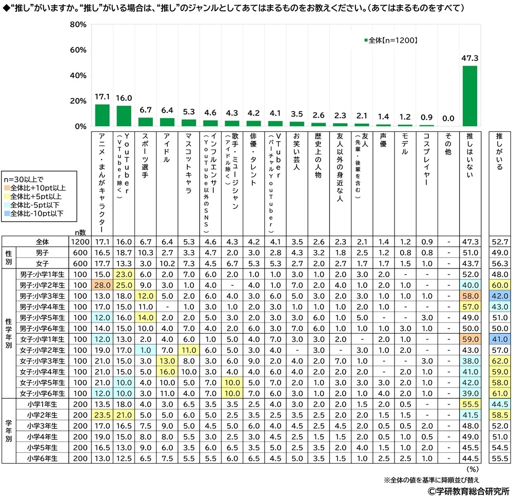 ★「推しがいる」小学生の53%、推しのジャンルTOP2は「アニメ・まんがキャラクター」「YouTuber」