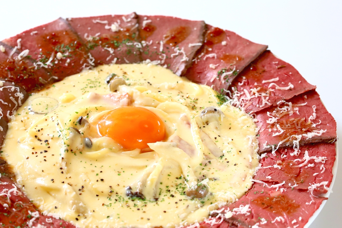 その生パスタをベースに、たくさんの自家製やわらかローストビーフを、お皿のまわりをぐるりと囲んだ衝撃のメニューです。