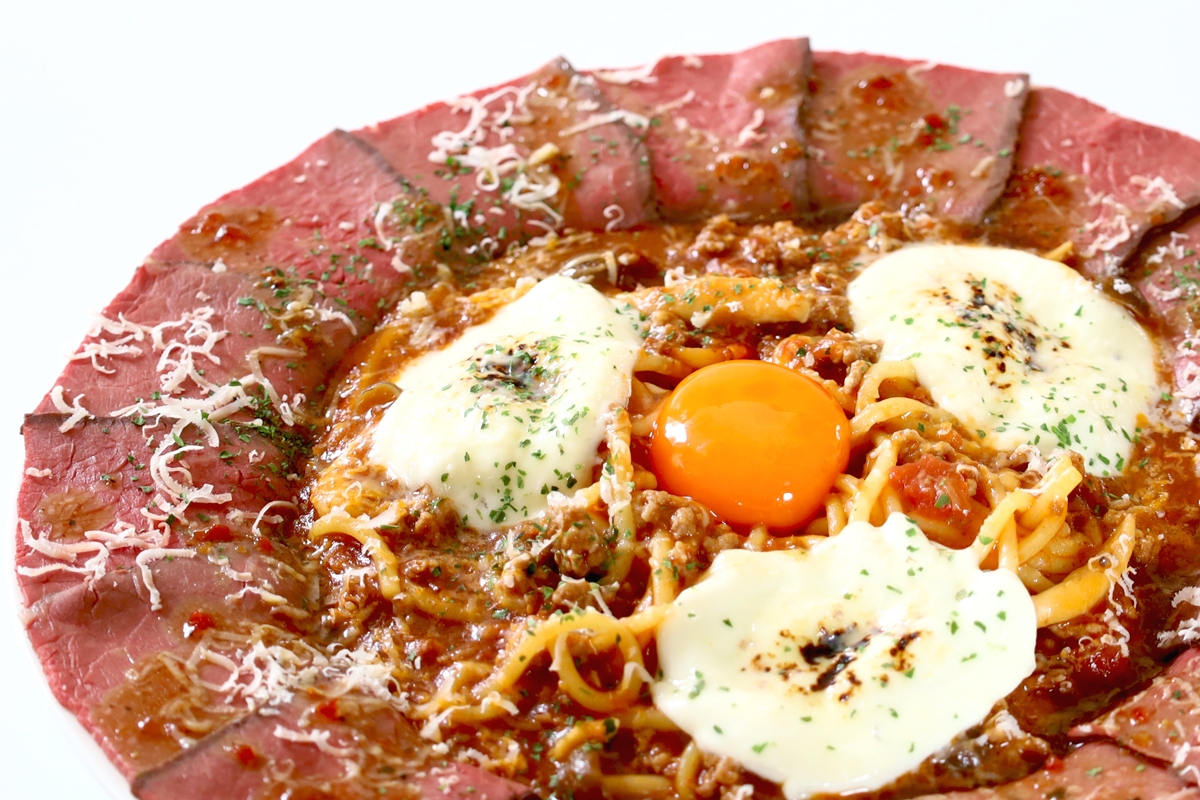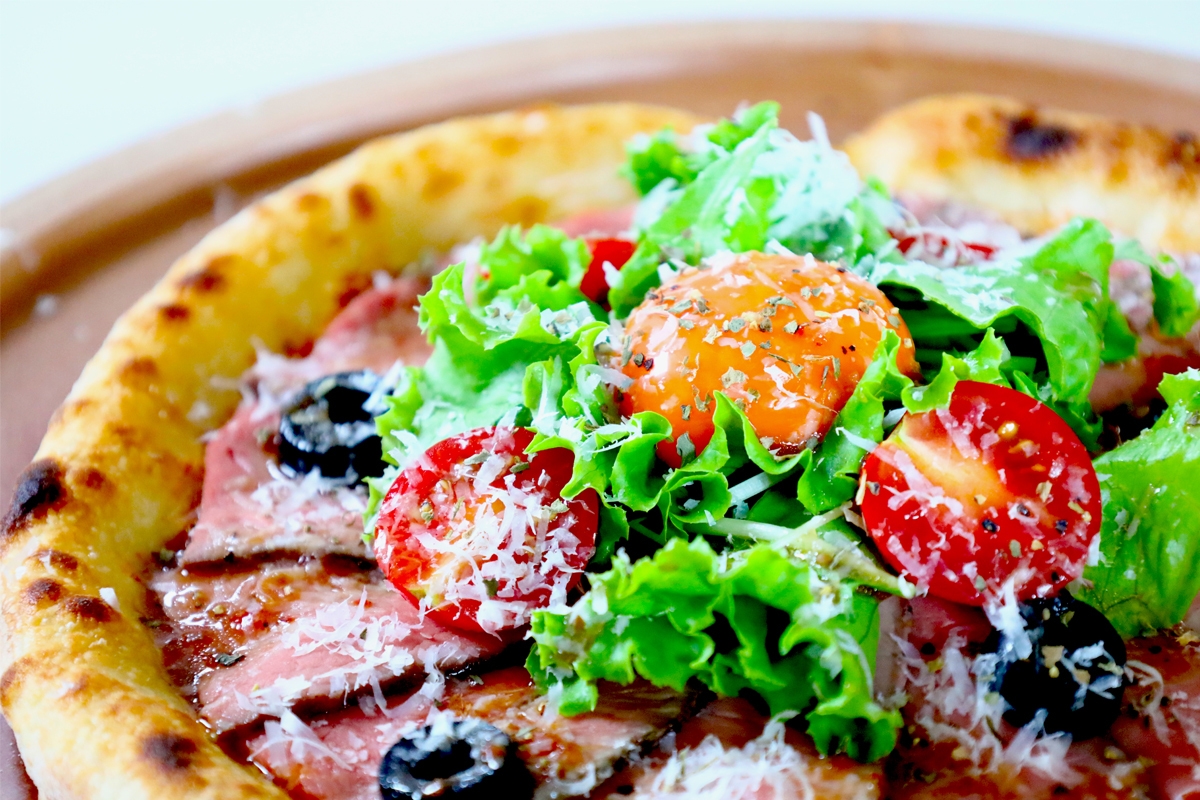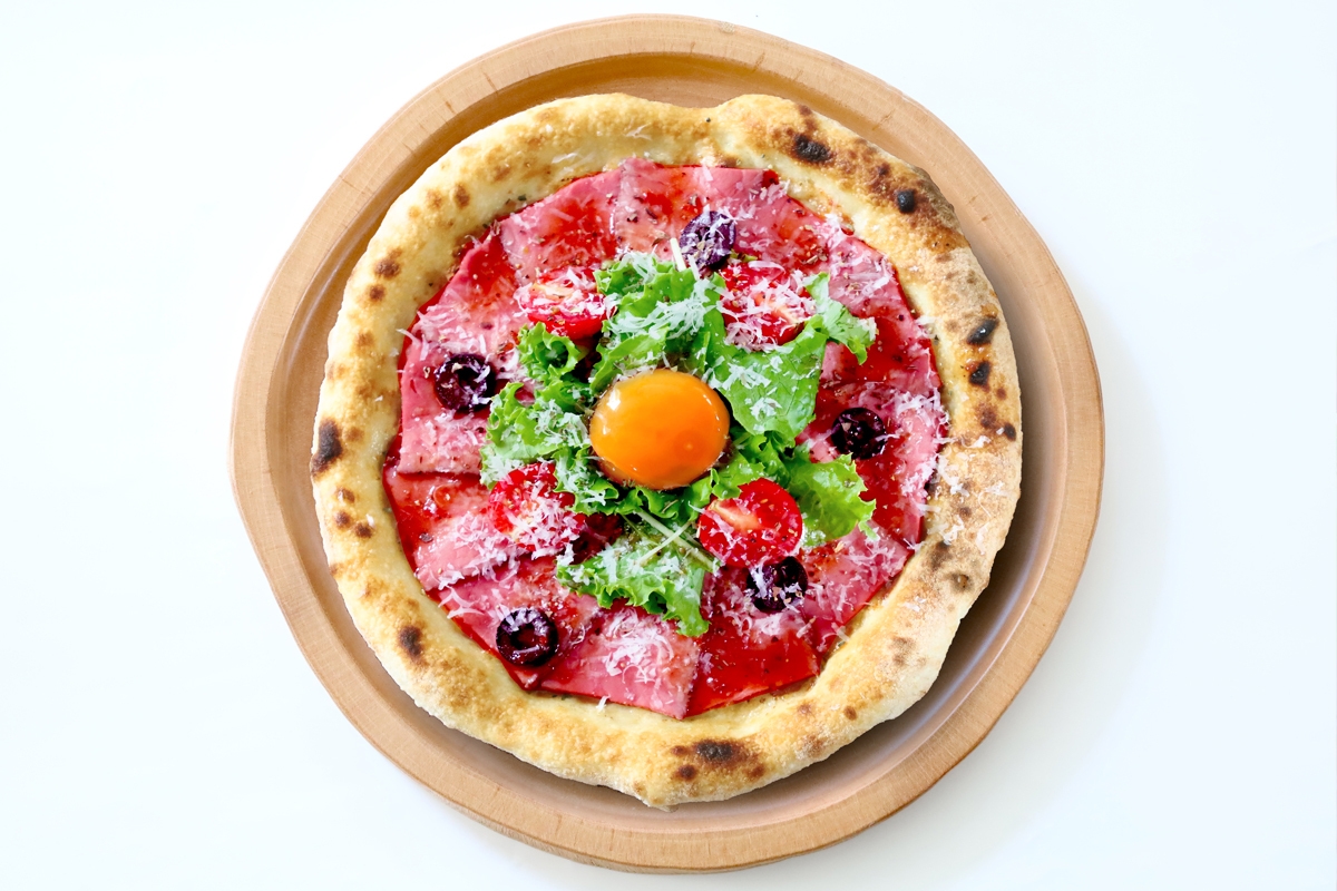 青森県産小麦粉「ゆきちから」と「きたかみこむぎ」を独自のバランスで配合した自家製ピッツァ生地のまわりをローストビーフでぐるりと囲み、仕上げにブランド卵「緑の一番星」の卵黄をトッピング。