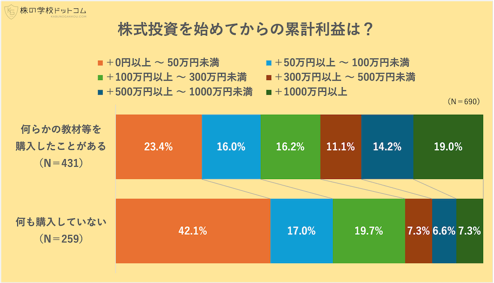 今回の調査では、株式投資の累計損益についても回答してもらいました。そして、上の質問で何らかの有料教材等を購入したことがある人と回答した人の累計利益を見てみると、何も購入したことがない人よりも、利益額が大きくなっていることがわかりました。