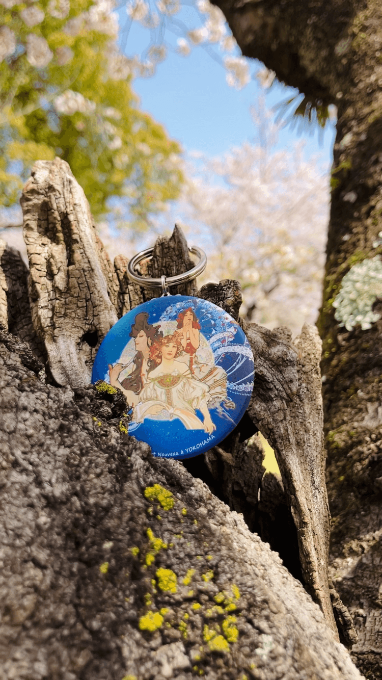 4月18日(金)の初日にご来場いただいた方、先着500名に「展覧会オリジナル缶バッジキーホルダー」をプレゼント!ミュシャの人気作「夢想」「モナコモンテカルロ」「JOB」がデジタル加工された、展覧会のメインビジュアルがプリントされた非売品で、横浜会場だけのオリジナルグッズです。