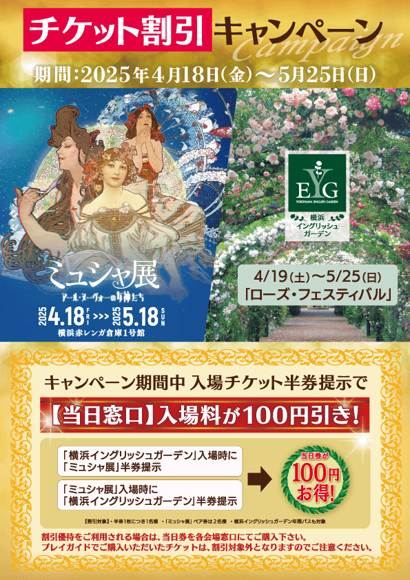 4月18日(金)~5月25日(日)までのコラボキャンペーン期間中、横浜イングリッシュガーデンと本展の半券をお互いの会場で当日券購入時に提示すると、100円引きになります。
