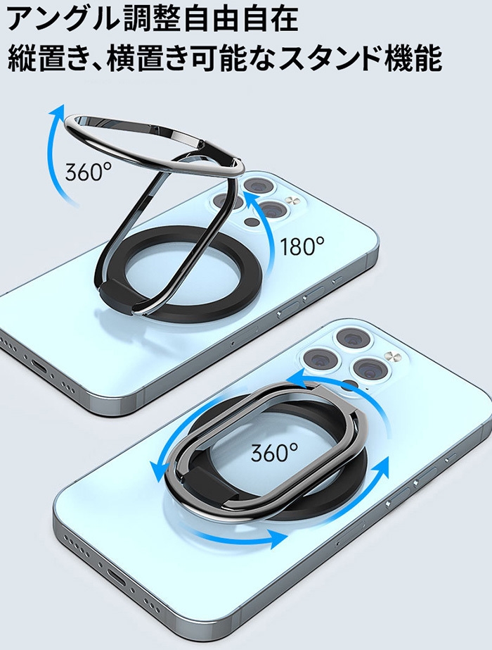 現在多数の小型MagSafe対応スマホリングスタンドが出回っていますがサポートリング部分の面積が小さいため、スマホを傾けるだけのスタンド製品がほとんどです。