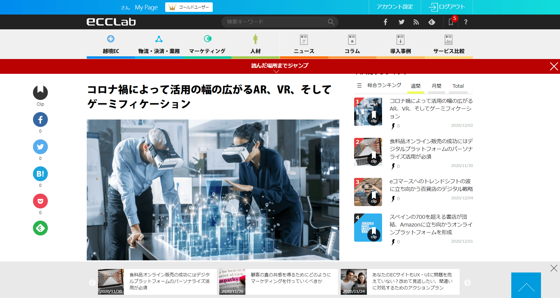 既にスマホ版では導入されている、お気に入り追加ボタンを「クリップ」機能、「読んだろことまでジャンプ」リンクをPC版でも利用できるようになりました。eccLabは、記事の文字数が5,000文字を超えるコラムも多く、一度に読み終わらない記事や、後で読み返したい記事も多く存在します。そのため、スマホ版だけでなくPC版でも両機能の提供を開始しました。