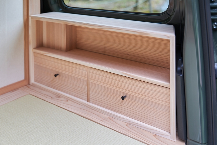 左右の棚は、京都の杉で柾目を使用。湿気がこもりやすい車内でも木の収縮による狂いを少なくするための工夫です。シガーソケットにIHコンロなどをつなぐことで出先でもお湯を沸かし一服をお楽しみいただけます。