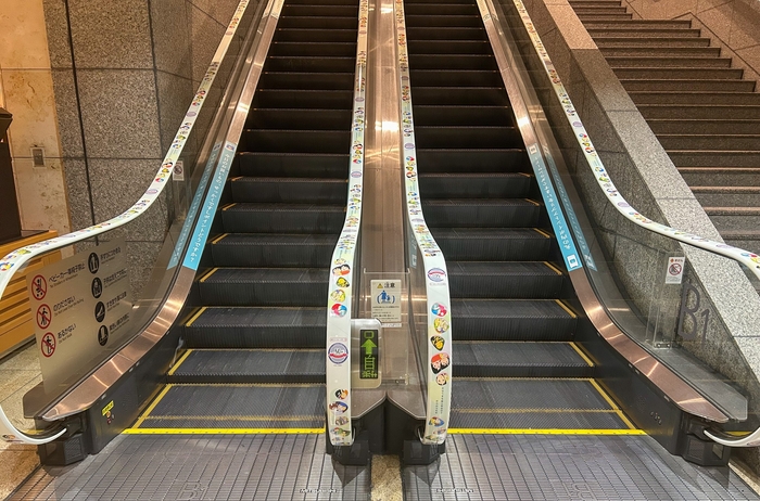 掲出するのは、エスカレーターの手すりをウレタンシートで覆う「UDベルト」(株式会社UDエスカレーター提供)です。従来のポスターや映像広告がキャラクターを“見る”存在として届けてきたのに対し、UDベルトは、利用者が自然に手を添える場所にキャラクターを配置することで、まるでキャラクターが寄り添い、支えてくれるかのような体験を生み出します。さらに、このベルトは転倒リスクを軽減する機能を持ち、キャラクターたちは利用者の安全を守る役割も果たしています。