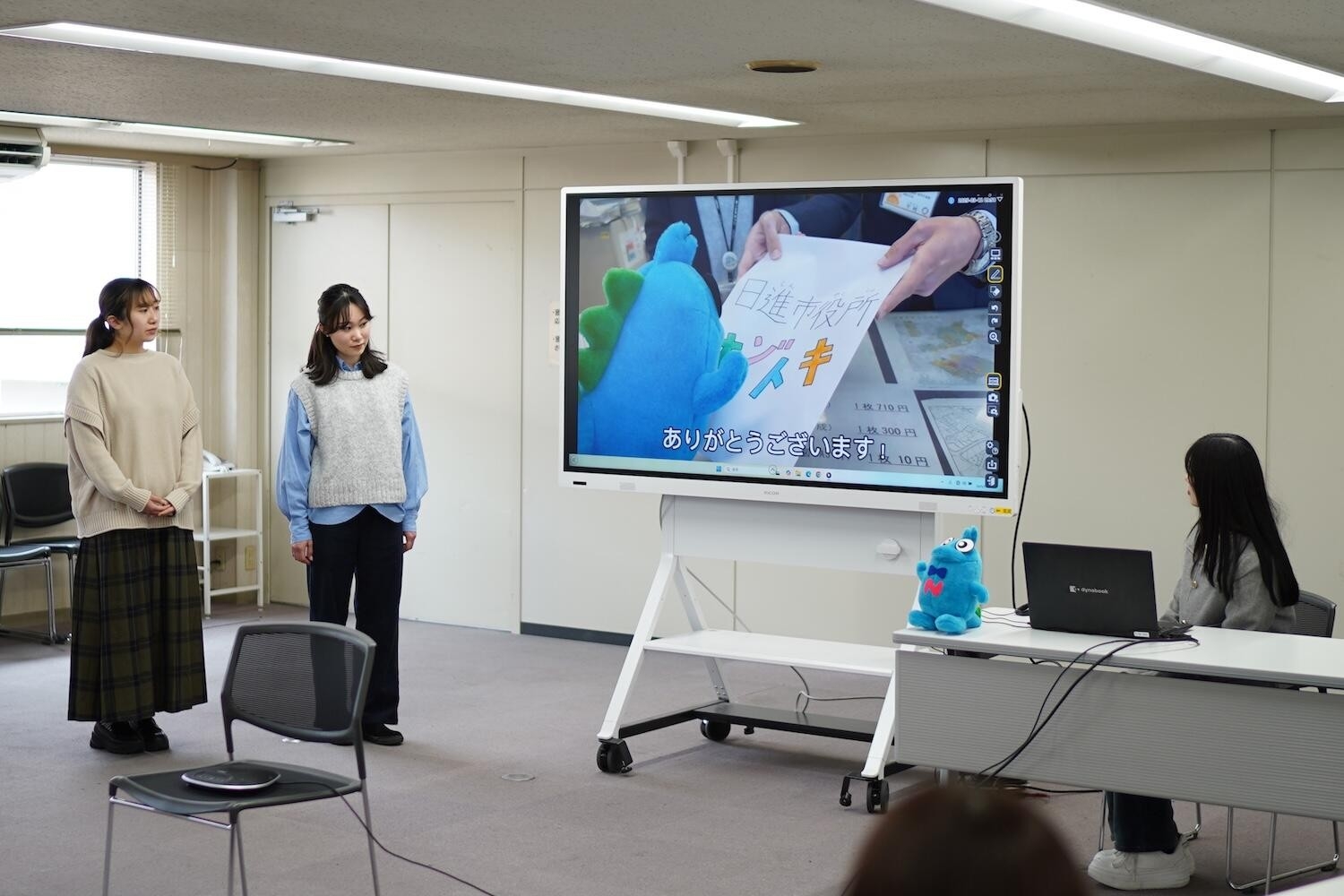 そして、2025年1月に日進市役所で撮影を実施。監督、カメラ、出演者、裏方など、各々が役割を持って臨みました。現場での試行錯誤もあったようです。「画角やピントの合わせ方を考えて撮影した」とカメラ役の中田さん。「キャラクターの動きの大きさ、しゃべり方を工夫した」という森さん、伊藤さん、三並さん。「キャラクターを支えたり、小道具を用意したり」と進行をサポートした吉村さん。見やすく、伝わりやすい動画にするためにあれこれ模索しました。綿密な準備のおかげもあって撮影はスムーズに終了。約1ヶ月半かけて編集され、動画が完成しました。