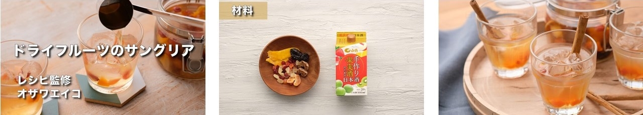 アミノ酸などの旨み成分をたっぷり含んだ「手作り果実酒のための日本酒」で仕込むことで、まろやかでコクのある味わいに仕上がります。料理研究家 オザワエイコさん(※)によるレシピは簡単で、彩り鮮やかなおいしい果実酒やサングリアが手軽に楽しめます。できあがったお酒は、ストレートはもちろん、ロックやソーダ割り、ホットなど、さまざまなアレンジも楽しめます。
