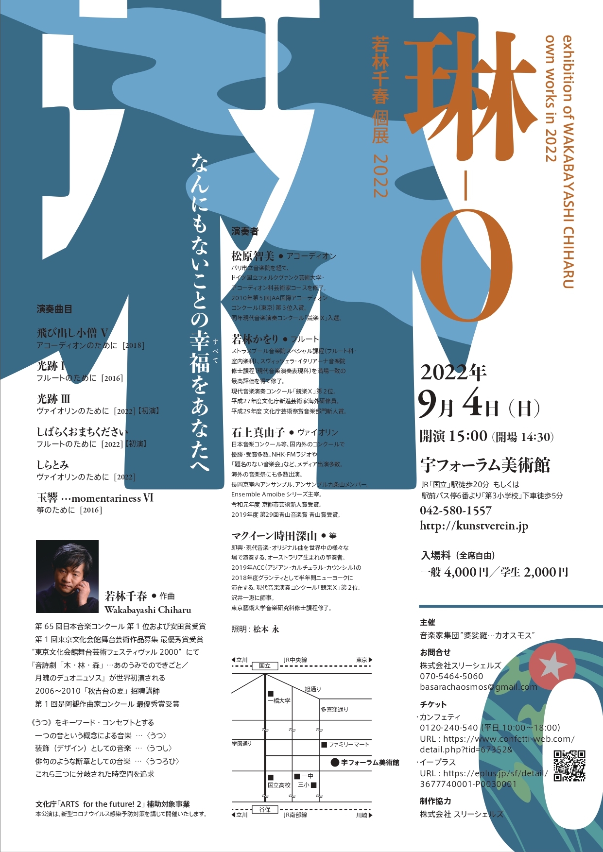 音楽家集団“婆娑羅…カオスモス”主催『琳-0 若林千春 個展 2022』が2022年9月4日 (日)に宇フォーラム美術館(東京都国立市東4-21-3)にて開催されます。