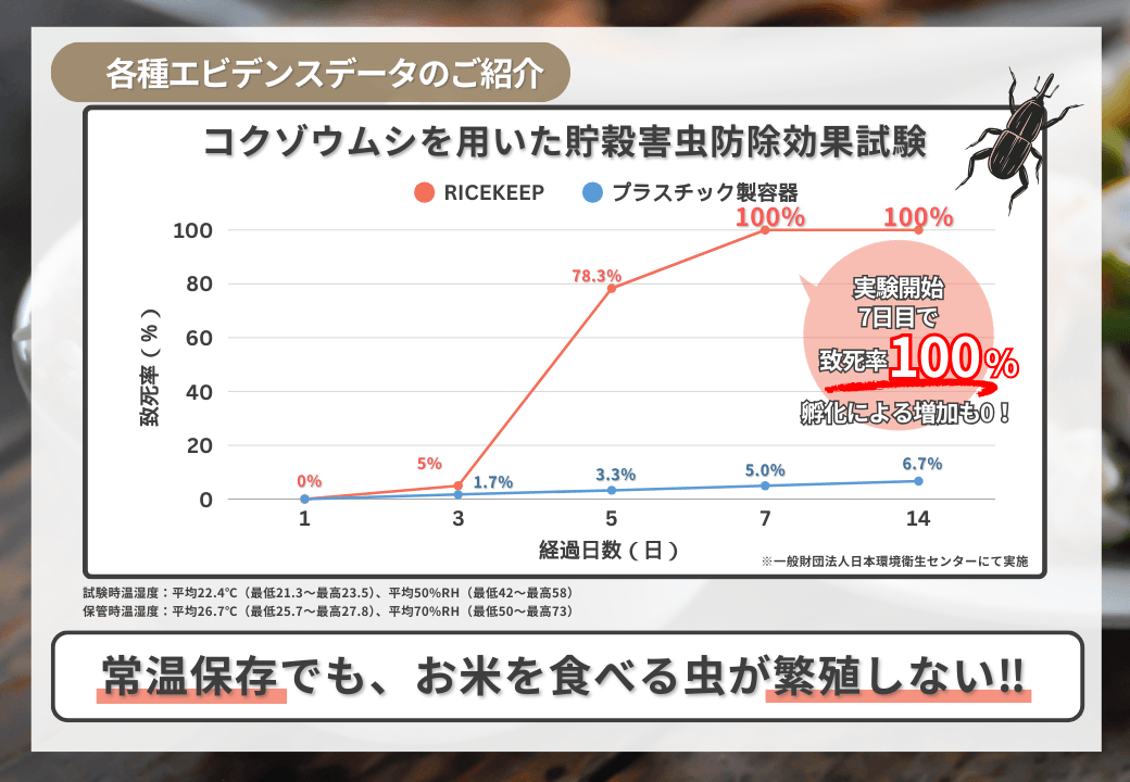 ● 虫害試験:お米の大敵「コクゾウムシ」を用いた試験で、孵化・増殖しないことを確認。
