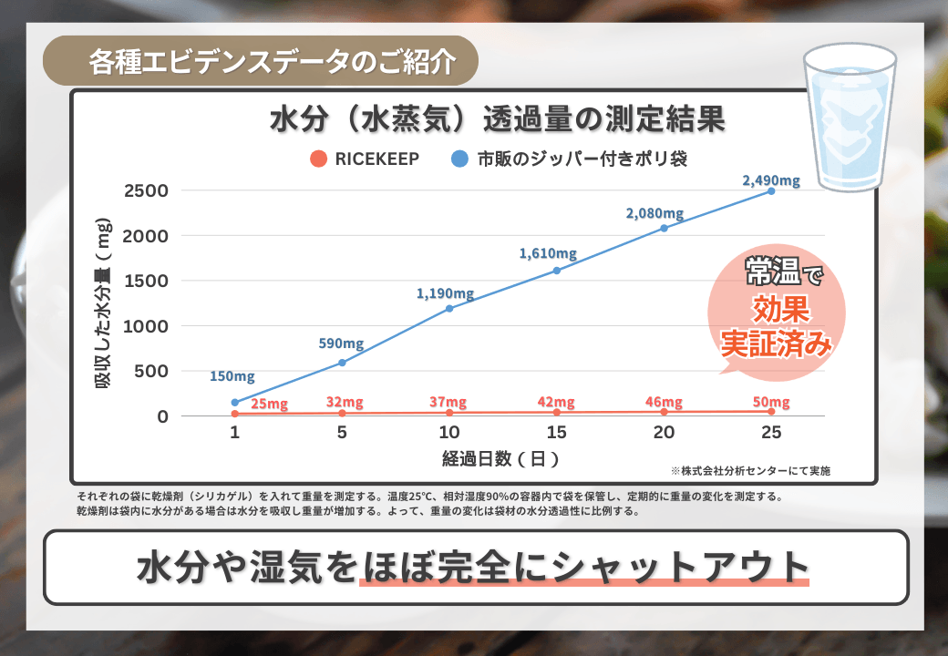 ● 米の水分(鮮度)保持試験:新米時の水分量を長期間維持できることを確認。