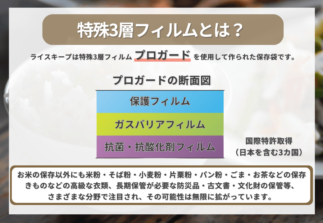 今回発売する「プロガードライスキープ」は、当社が独自開発した国際特許取得の三層構造フィルム「プロガード」を採用しています。これにより、従来の米保存にはなかった革新的な機能を実現しました。