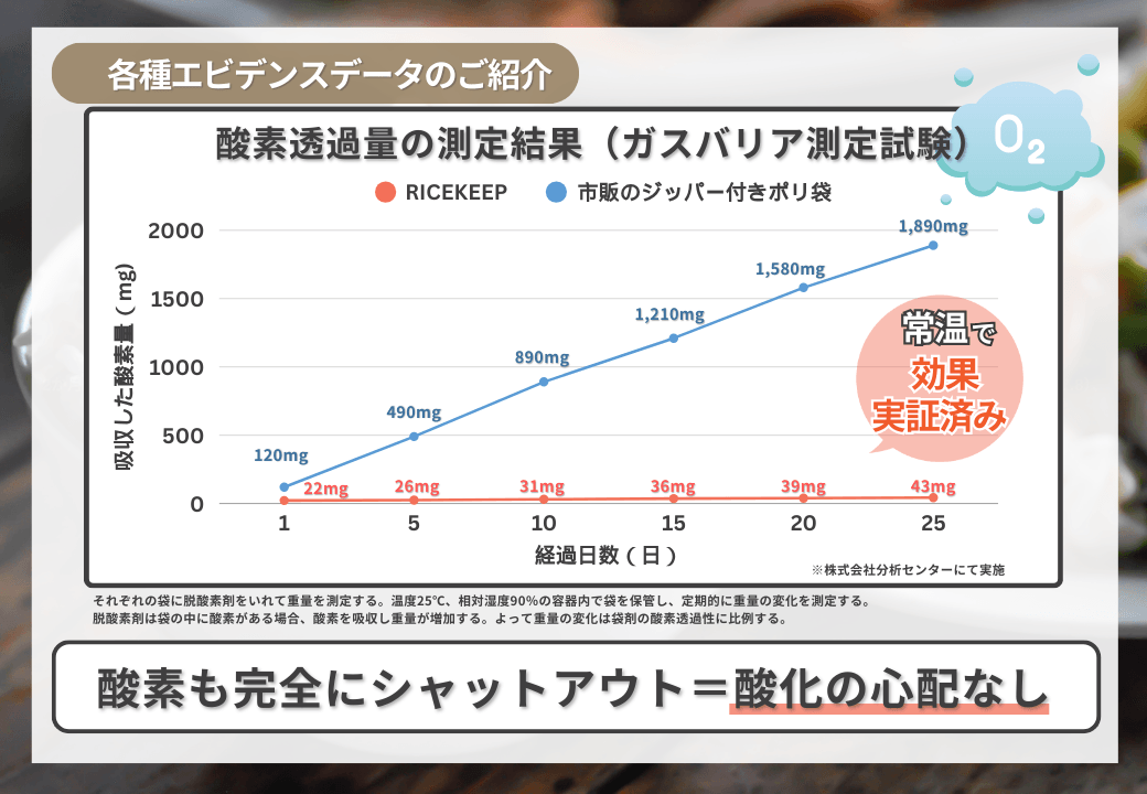 ● 酸素透過量の測定:一般的な保存袋に比べ、酸素透過を大幅に低減。