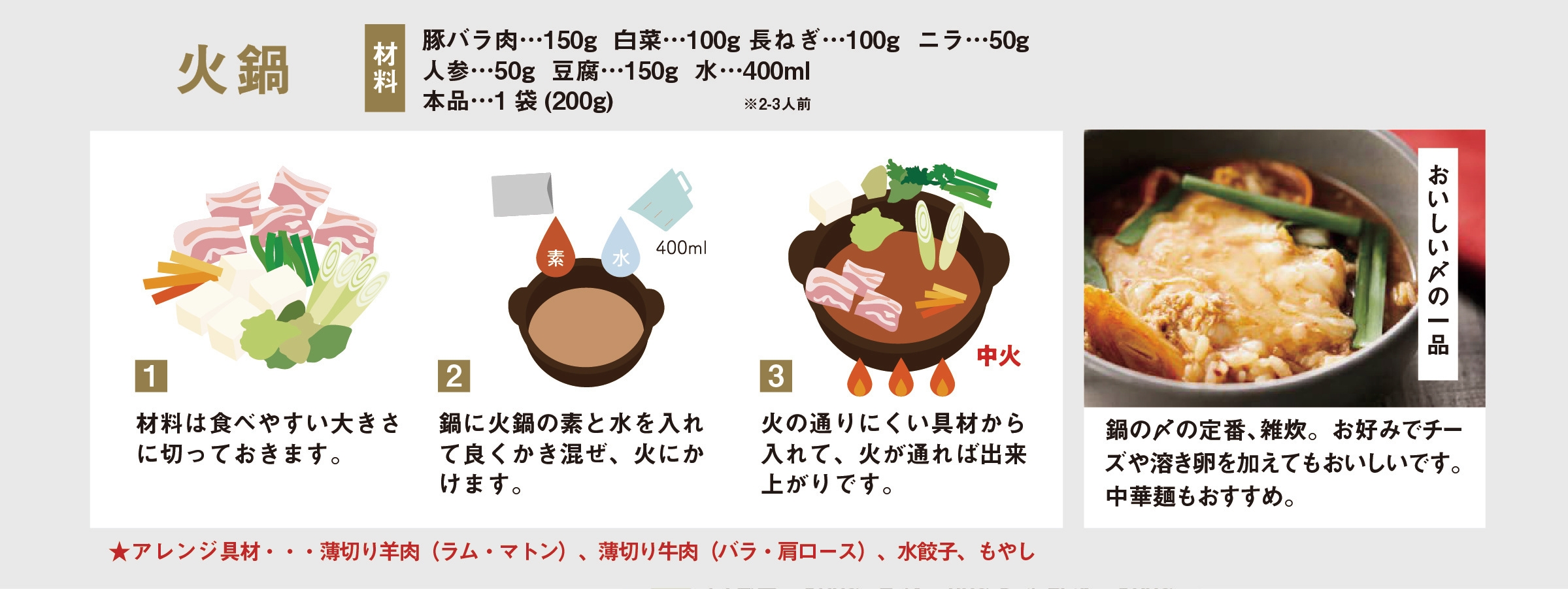 中国発祥の「火鍋」をお手本にしました。かきやほたての旨みたっぷりのスープに、赤唐辛子やコチュジャンのあと引く辛さがクセになる味わいです。【内容量200g 価格420円(税込)】
