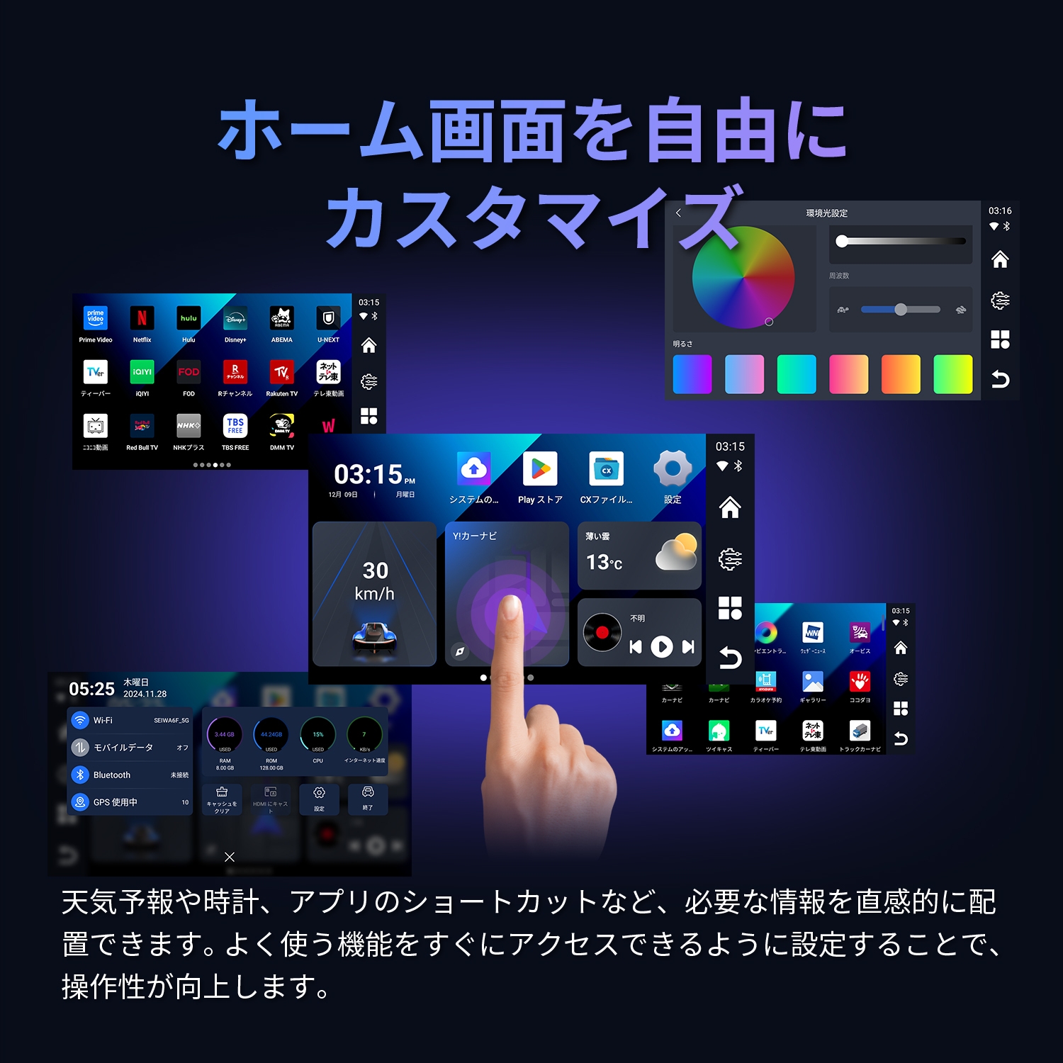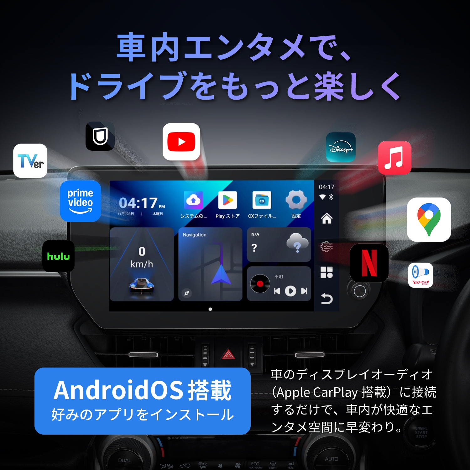 Android OSを搭載し、YouTube、Netflix、Hulu、Amazon Prime Videoといった動画配信サービスからGoogle MapやYahoo!カーナビなどのナビアプリまで、幅広いアプリを自由にダウンロードして利用可能です。