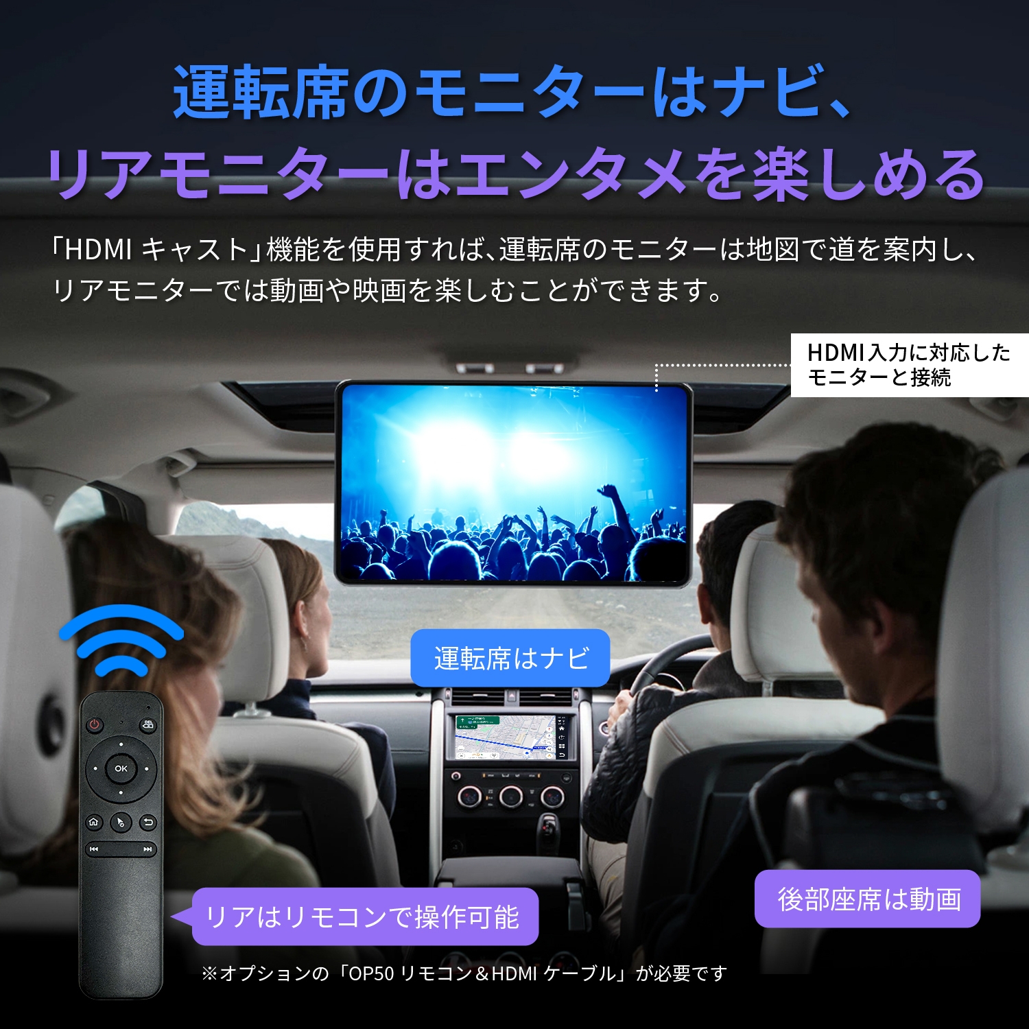HDMI入力対応のモニターにオプション品『OP50』を接続することで、リアモニターでも映像を視聴できます。さらに『HDMIキャスト』機能を使えば、運転席では地図で道案内を表示し、リアモニターでは動画や映画を楽しむことができます。