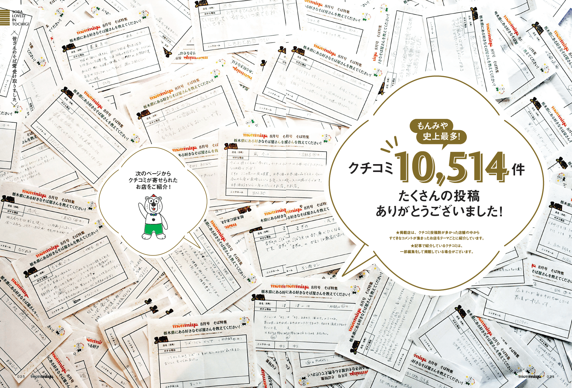 もんみや8月号は、最新版となる「そば特集」。発行するたびに、売り切れが続出する人気特集です。今年のそば特集では、栃木県内を中心としたそば愛好家の皆様から「好きな栃木県内のそば」に関するクチコミを募集。約2ヶ月間の募集期間中、チラシのアンケートフォームやハガキ、投票ボックスのほか、編集部自ら県内の施設やイベントに出向き、当誌史上最多の約10,514件を集めました(過去最高は約3,100件)。票数だけではなく、熱いクチコミが集まった店舗を中心に、計56店舗を編集部が厳選。皆さまからのすてきなコメントと一緒に紹介しています。「もんみや」史上最多1万件のアンケートをもとにした超保存版のそば特集です。