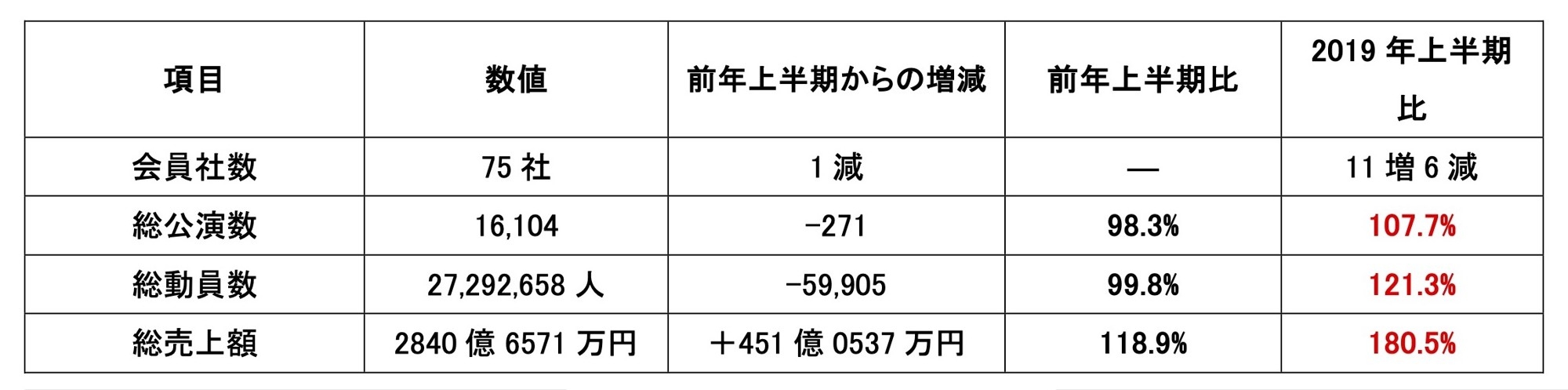 ①公演数および動員数は前年上半期から横ばいだが、市場規模は前年同期比118.9%に拡大している