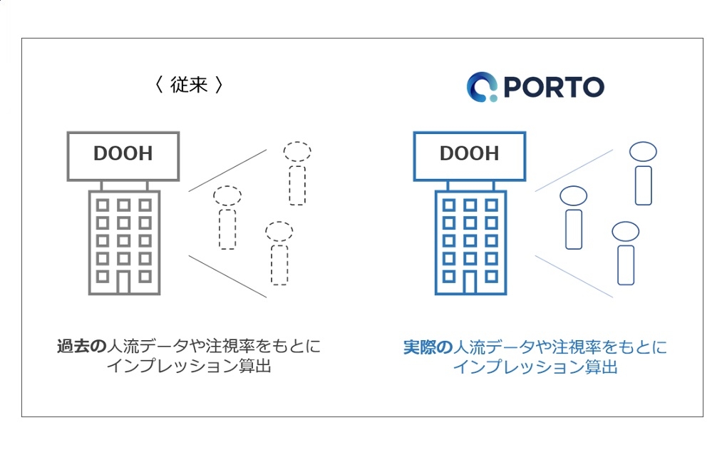 株式会社CARTA HOLDINGSのグループ会社で、統合マーケティングプラットフォーム「PORTO(ポルト)」(https://porto.cartaholdings.co.jp/)を運営する株式会社PORTO(東京都渋谷区、代表取締役:吉田 大樹)は、コロナ禍における日々の人流変動の拡大や、DOOH広告におけるアクチュアル計測の整備を背景に、2021年3月、「PORTO Premium DOOH」から配信可能なDOOH広告(Digital Out of Home:デジタル屋外広告)に対して、指標として一般的な想定値としてのヒストリカルデータではなく、広告が配信された時のアクチュアルデータ(実現値)を活用し、実際の人流データや注視率をもとにしたインプレッションに応じて課金することで、より実態に沿った効果的なDOOH広告の展開が可能になりました。