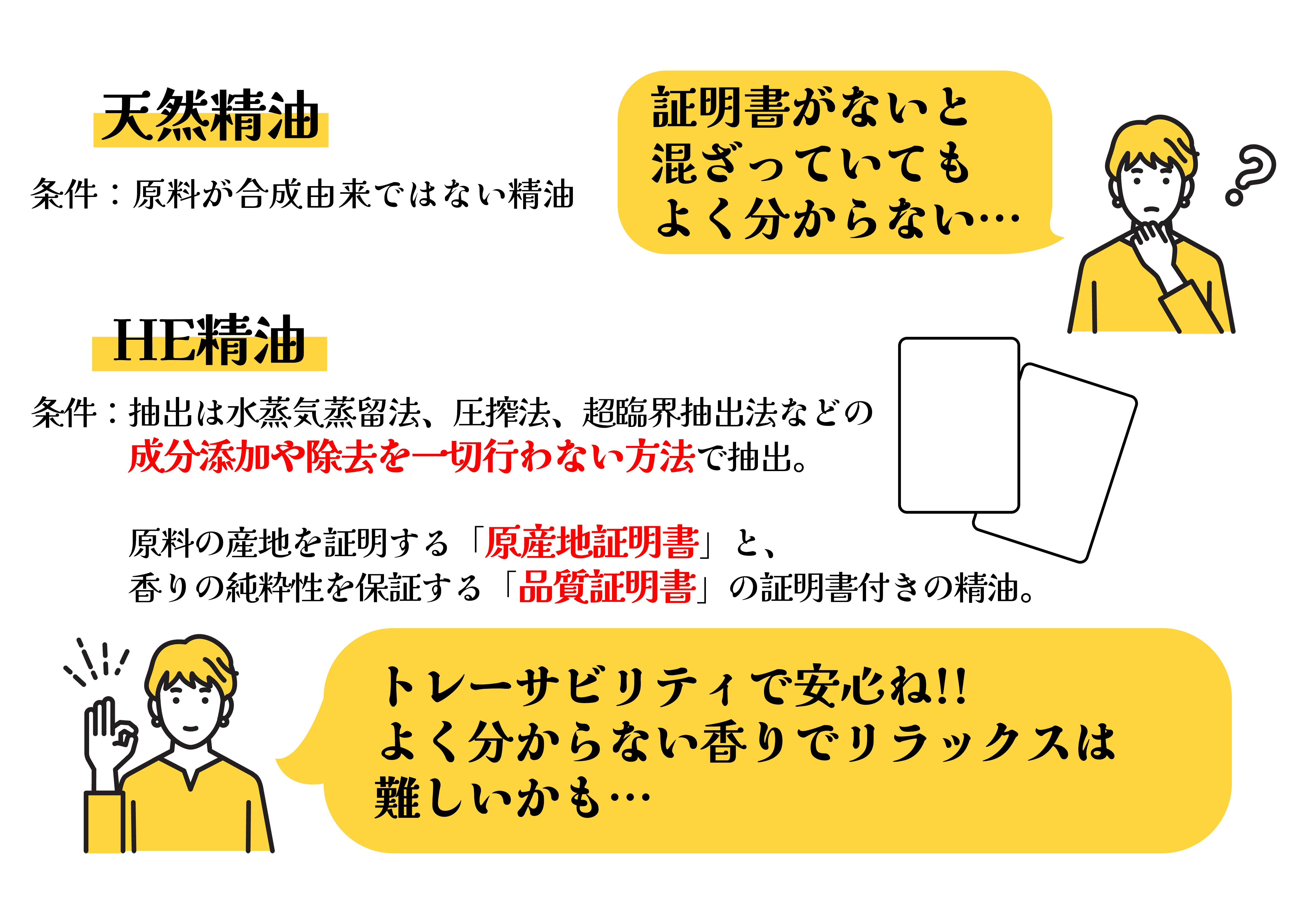 天然精油と聞くと100%天然のものと感じるかと思います。しかし証明書もないため、原産地が違う原料が混ざり、抽出方法に溶媒抽出が使われている可能性もあります。「HE」精油とは、香りの純粋性を証明する「品質保証書」と原料の産地を証明する「原産地証明書」の2通の証明書が添えられた精油を指します。宝石でいえば、ダイアモンドの最高級グレードを表す鑑定書にあたるものです。
